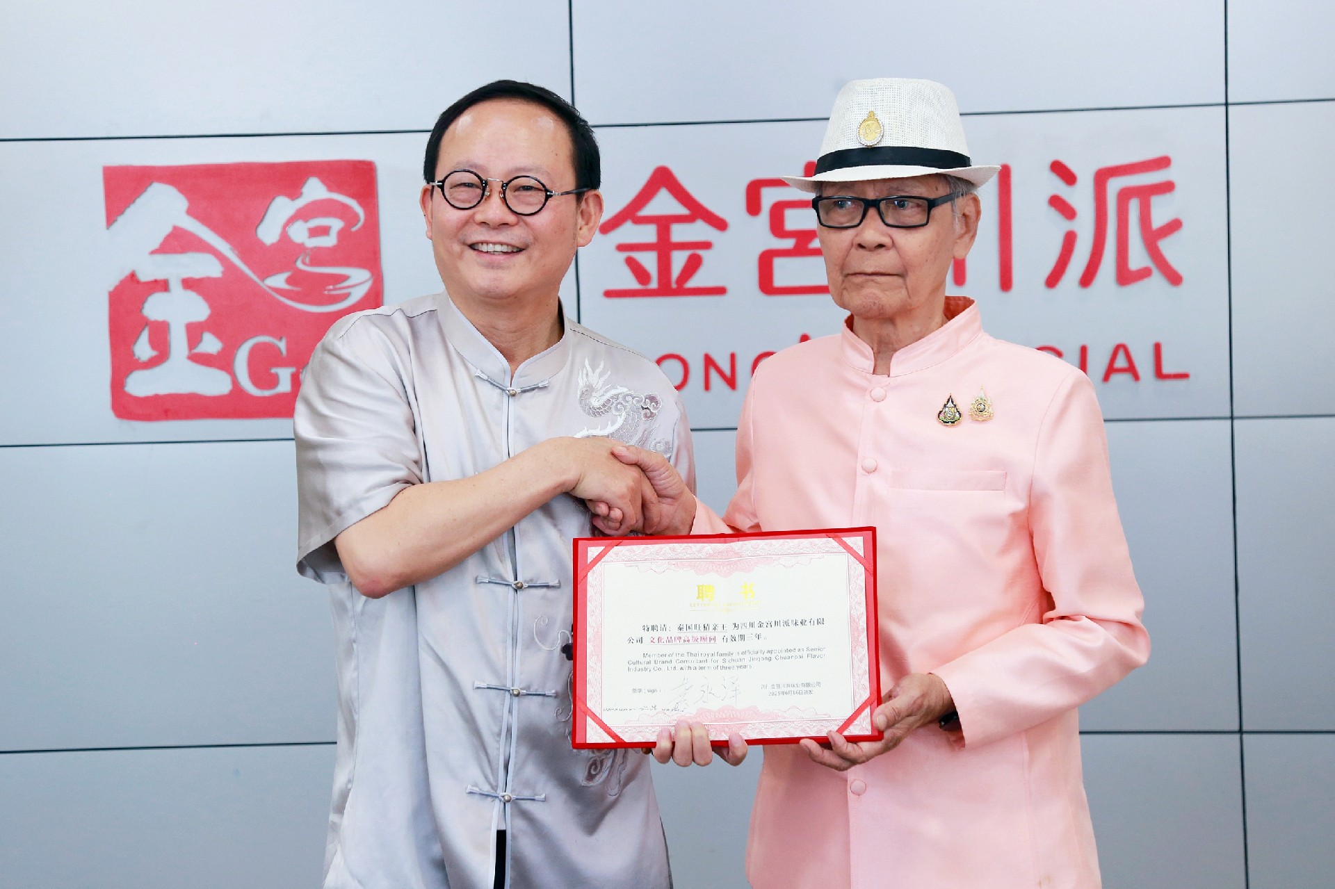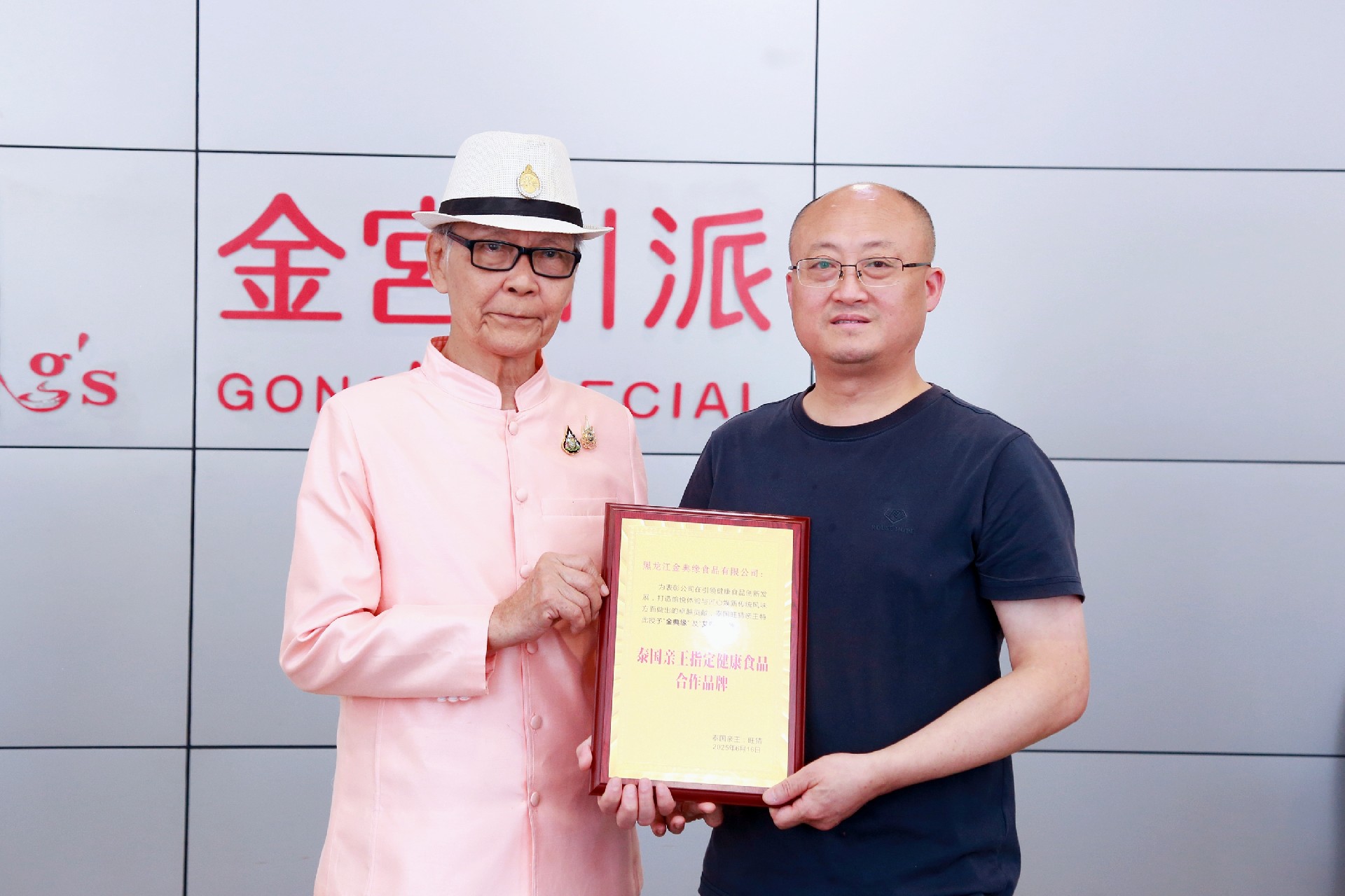 同時(shí),會(huì)上簽署了聘書和榮譽(yù)證書。龔永澤董事長(zhǎng)被特聘為泰國(guó)旺猜親王的川派美食顧問(wèn),并被特授予中泰美食文化大使稱號(hào)。金宮品牌被授予"泰國(guó)親王調(diào)味品御用品牌",川派、百信品牌被授予"泰國(guó)親王指定調(diào)味品合作品牌",金宮川派集團(tuán)旗下多個(gè)品牌同時(shí)被授予泰國(guó)親王指定合作品牌;金宮川派集團(tuán)特聘請(qǐng)?zhí)﹪?guó)旺猜親王為公司文化品牌高級(jí)顧問(wèn)。