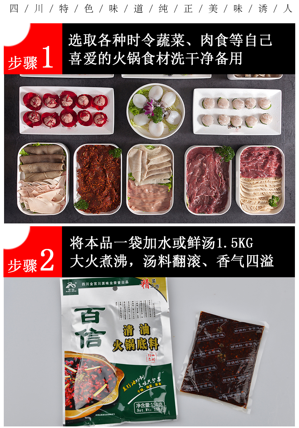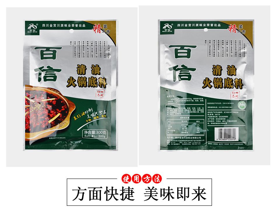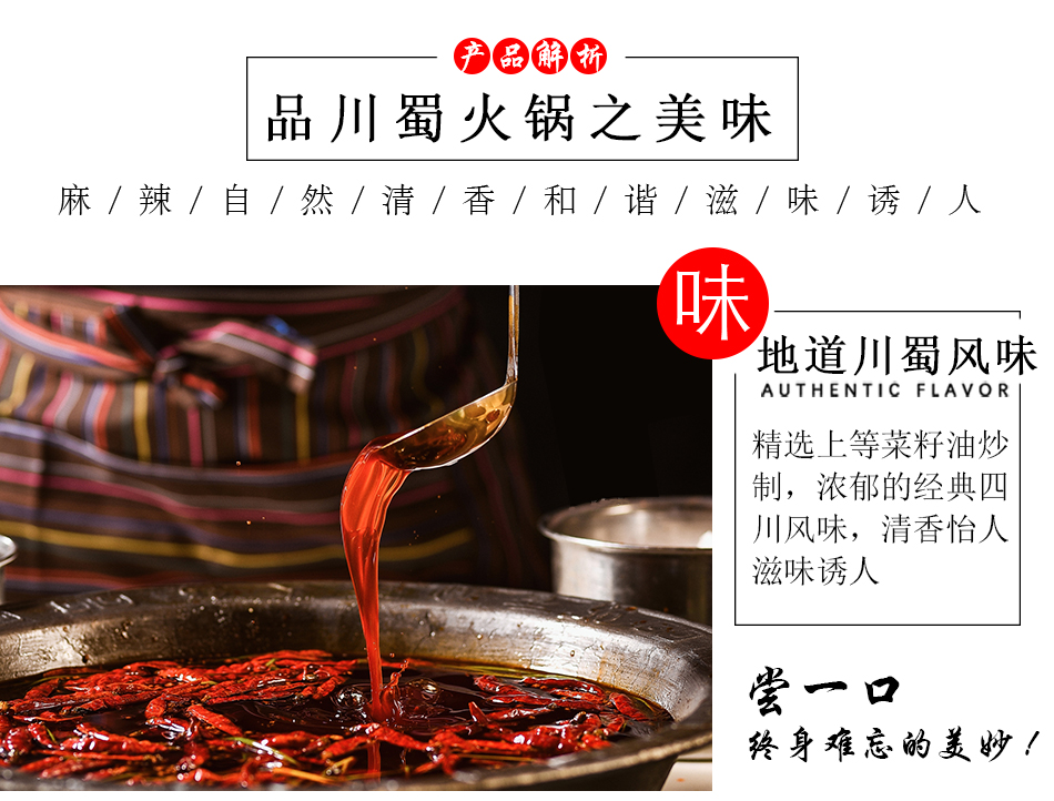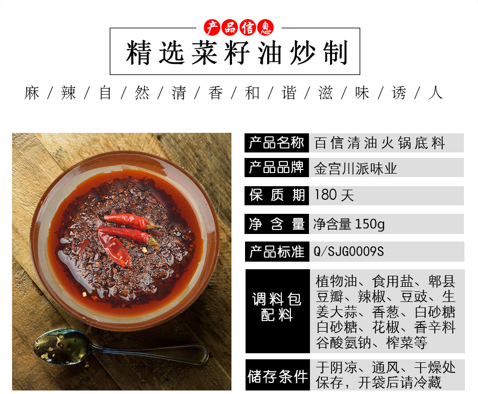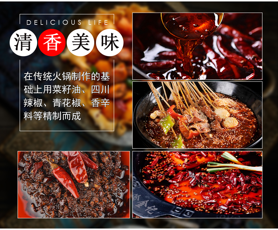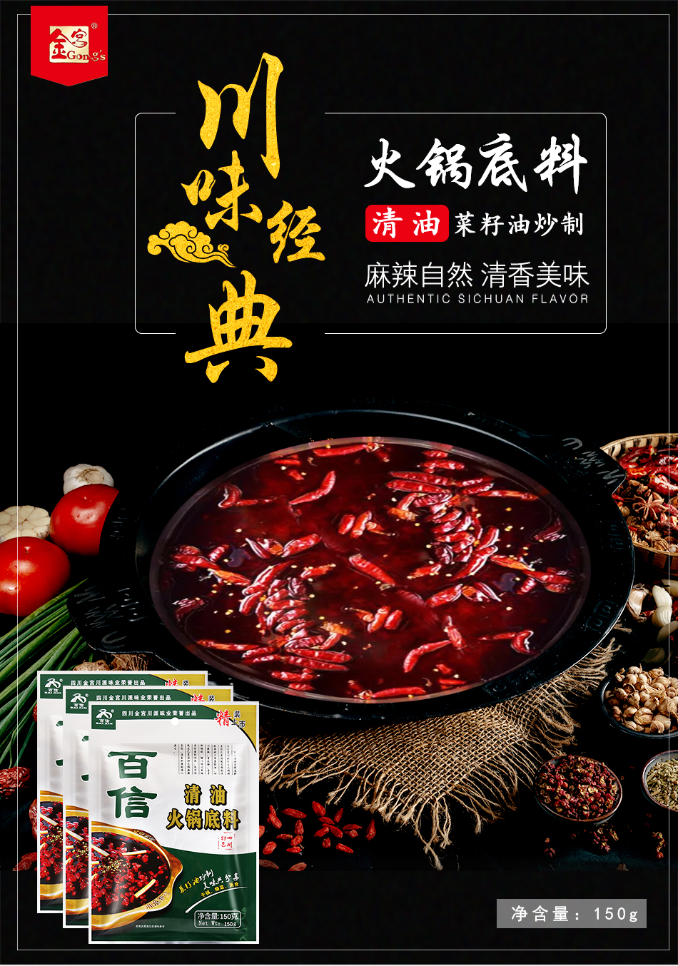 產品簡介:百信清油火鍋選用優(yōu)質菜籽油,經清真火鍋調味師,在民族古方的基礎上精心研制而成,色澤紅亮,香氣濃郁,味道鮮美,屬火鍋底料新秀,是餐飲、家庭制作火鍋的首選底料。