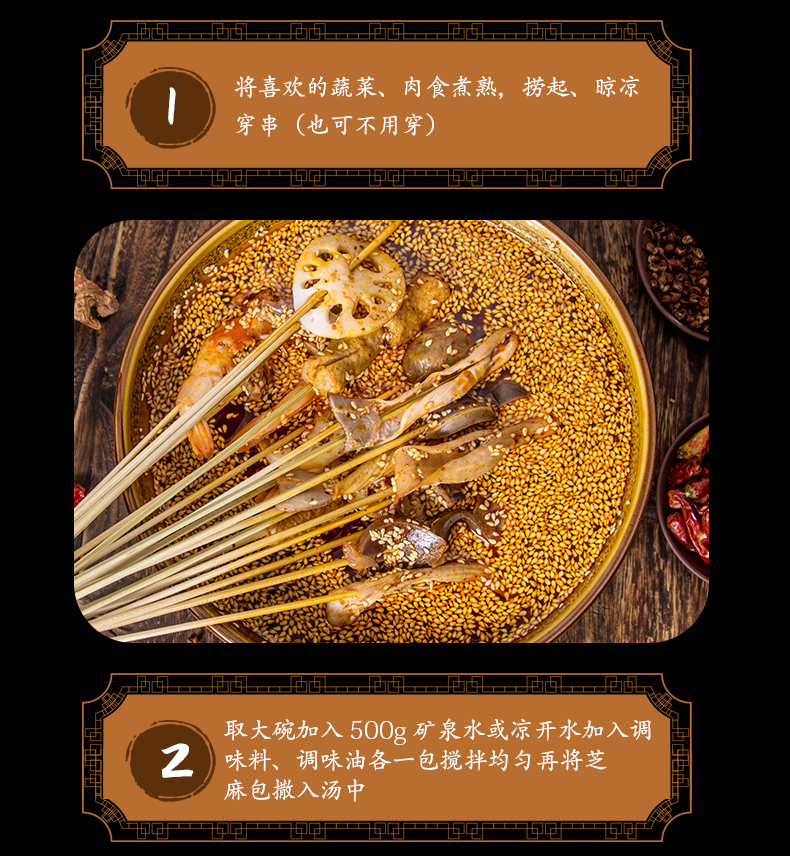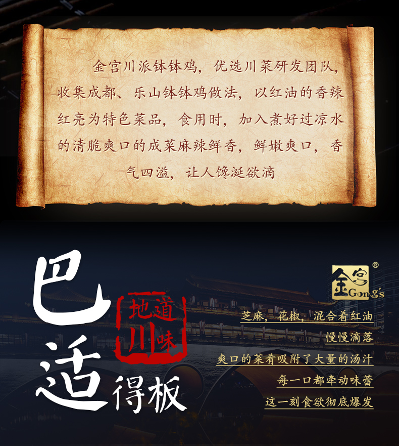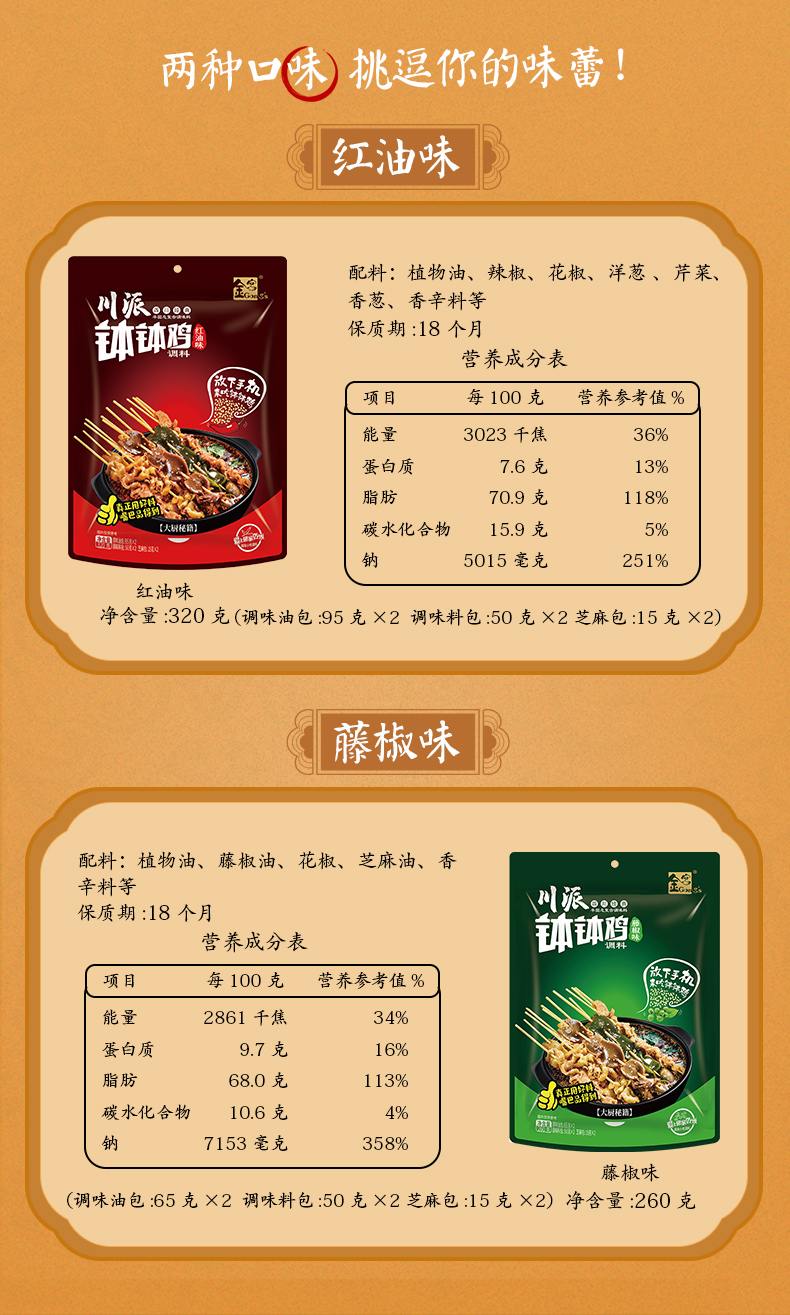 產(chǎn)品簡(jiǎn)介:本調(diào)料是金宮川派公司川菜研發(fā)團(tuán)隊(duì)收集成都、樂山缽缽雞的做法,以紅油的香辣紅亮為特色,成菜麻辣鮮香,鮮嫩爽口,香氣四溢,讓人饞涎欲滴。