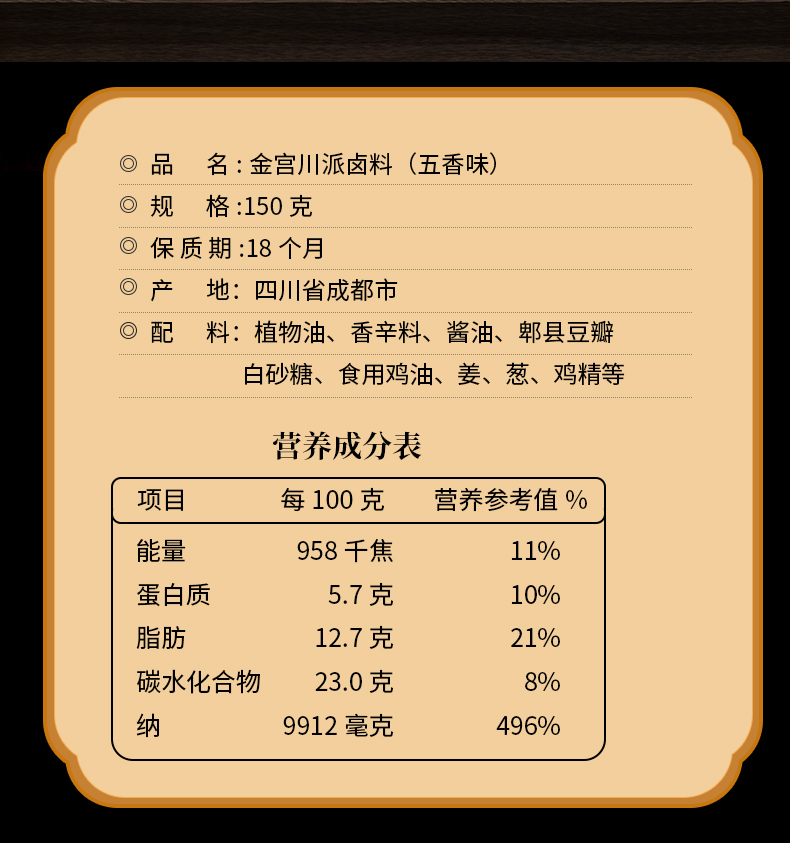 產(chǎn)品簡介:金宮川派五香鹵料精選20多種香辛料熬制、調(diào)味而成,用于調(diào)制鹵水。食材在鹵水中鹵熟后,芳香濃郁、鹵味十足,聞之垂涎欲滴,食之滿口生香。一袋金宮調(diào)料在手,鹵味輕松擁有!