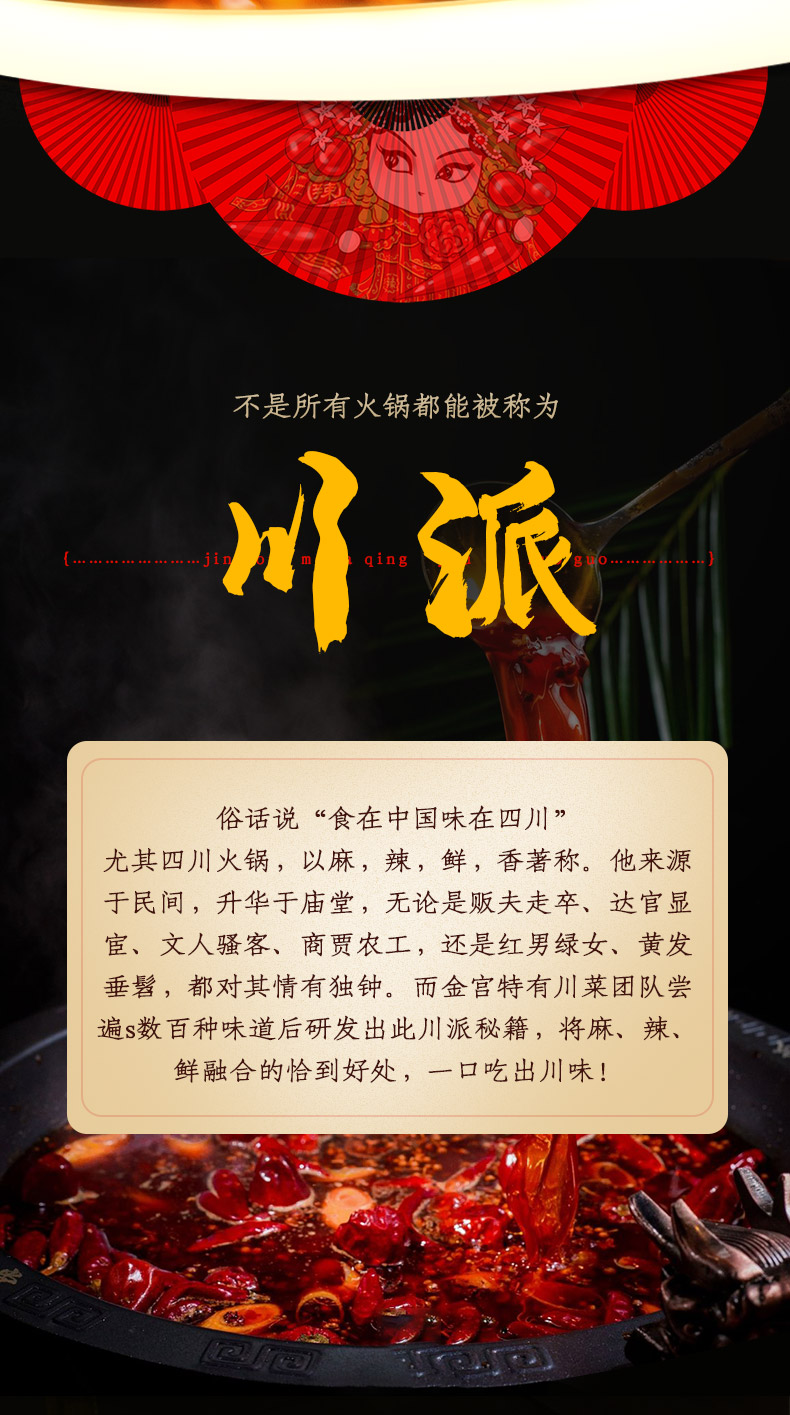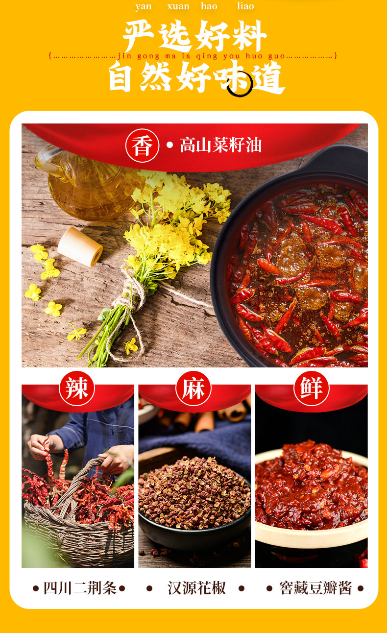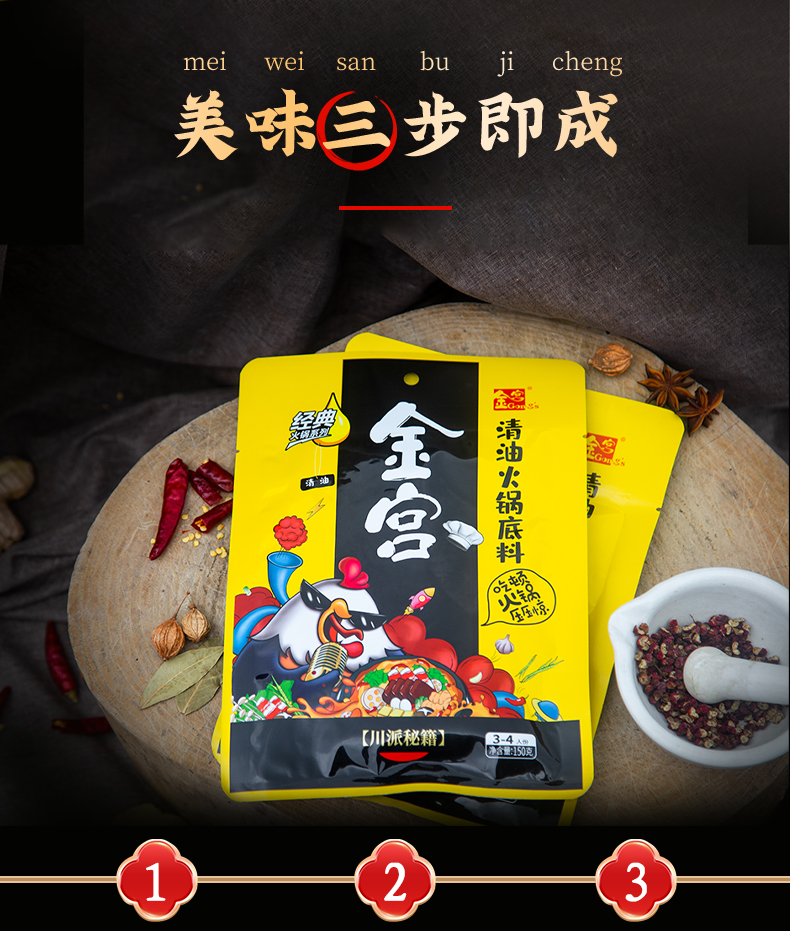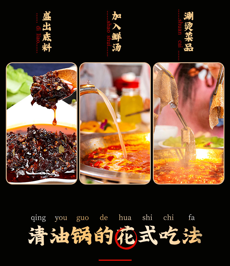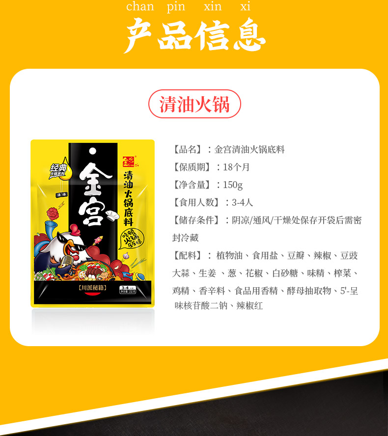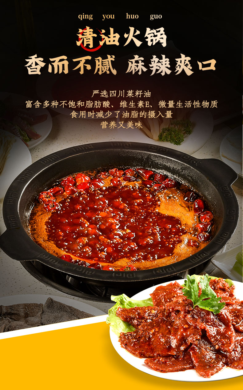 產(chǎn)品簡(jiǎn)介:金宮麻辣清油火鍋底料是金宮川派公司研發(fā),優(yōu)選四川菜籽油、四川花椒、辣椒、香辛料精制濃縮而成,充分體現(xiàn)出巴蜀清油火鍋麻辣純正、清香爽口的誘人滋味。