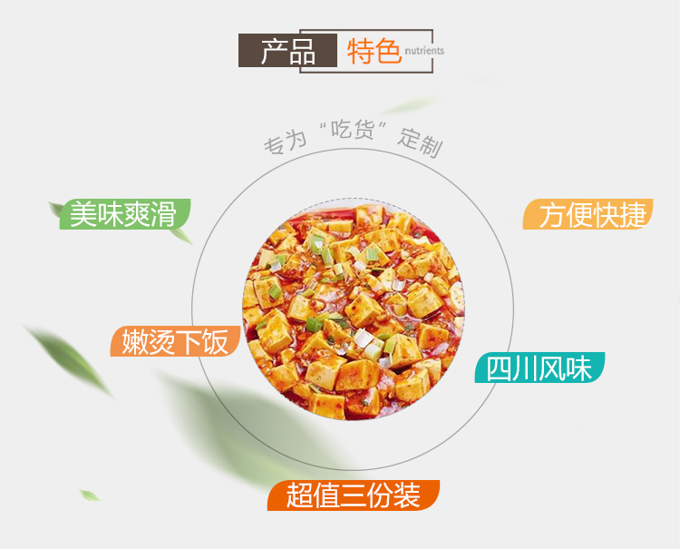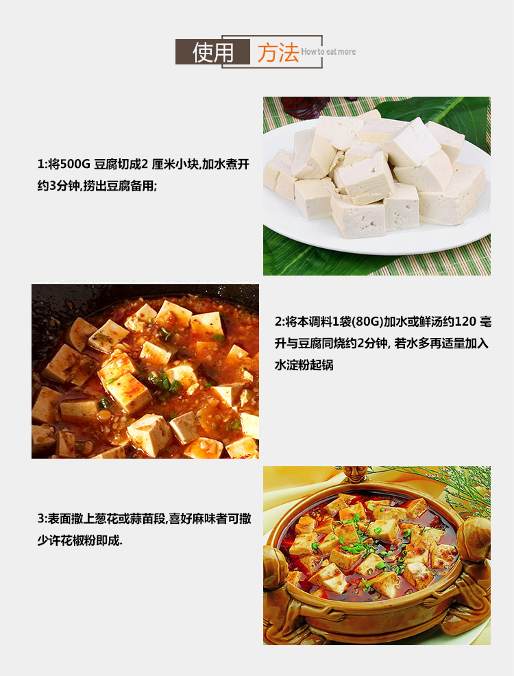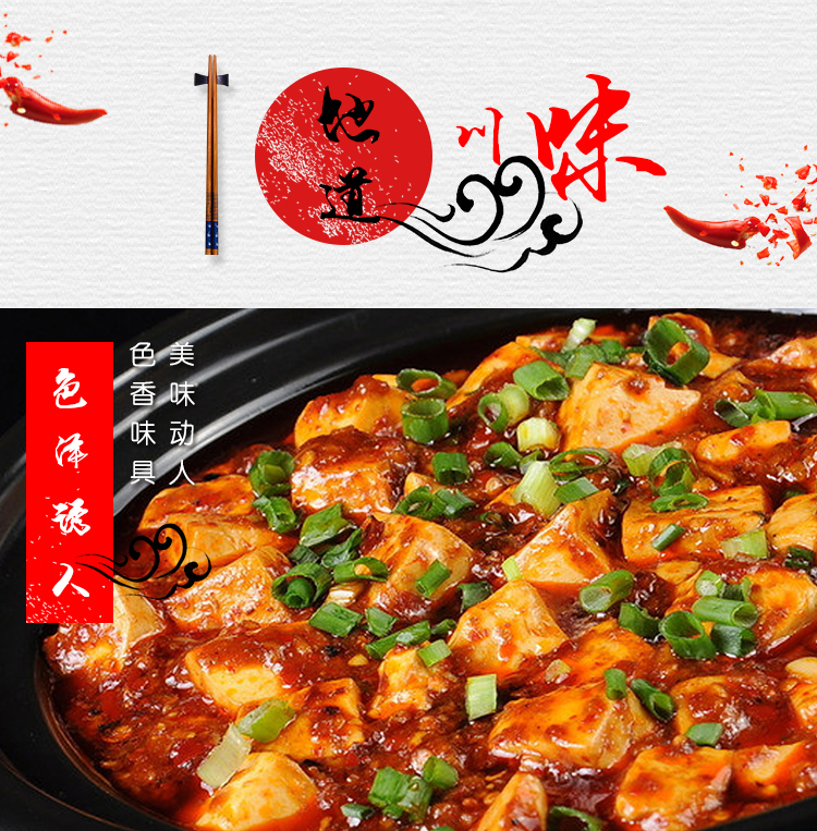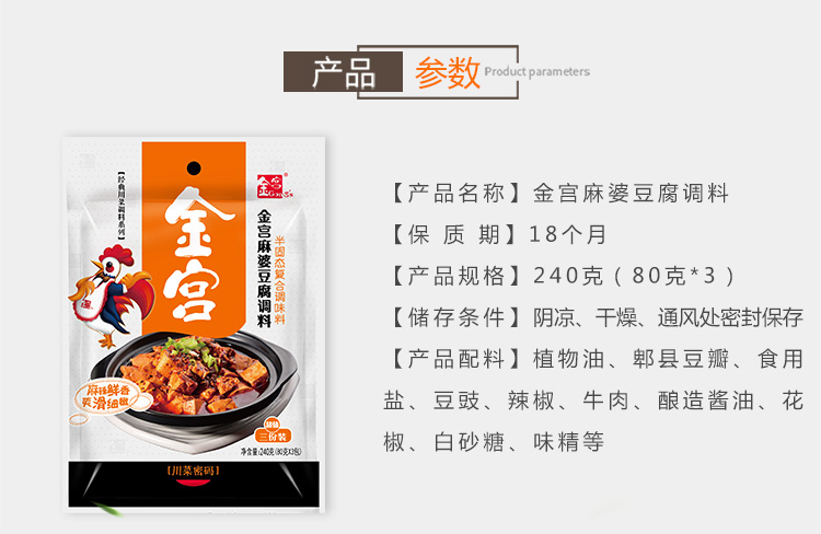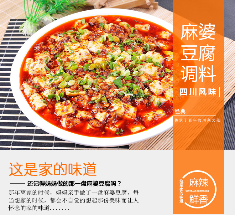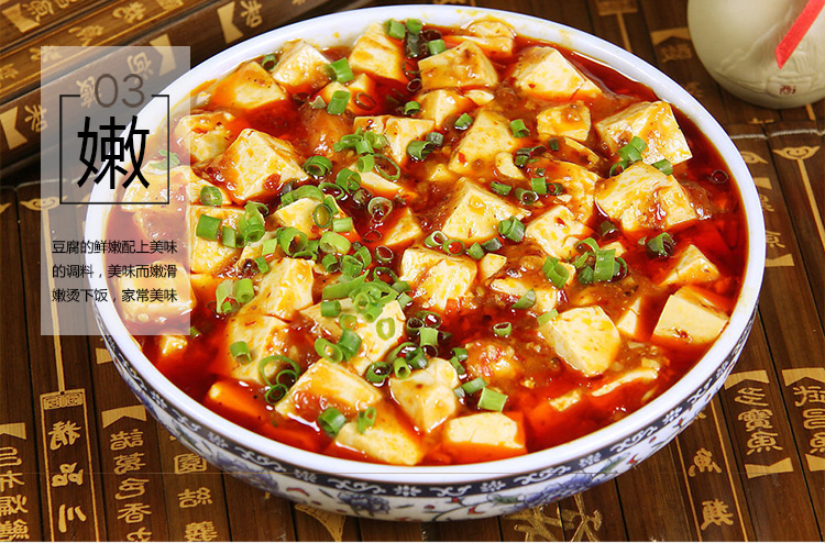 產(chǎn)品簡(jiǎn)介:四川名菜—麻婆豆腐,創(chuàng)始于清朝同治元年,其麻、辣、嫩、燙、酥、香的特點(diǎn),深受人們喜愛(ài)。金宮麻婆豆腐調(diào)料傳承經(jīng)典,創(chuàng)新研制,在保留菜品固有特點(diǎn)的同時(shí),豆腐與調(diào)料巧妙結(jié)合,滿足挑剔的味蕾,和家人朋友一起分享美味。