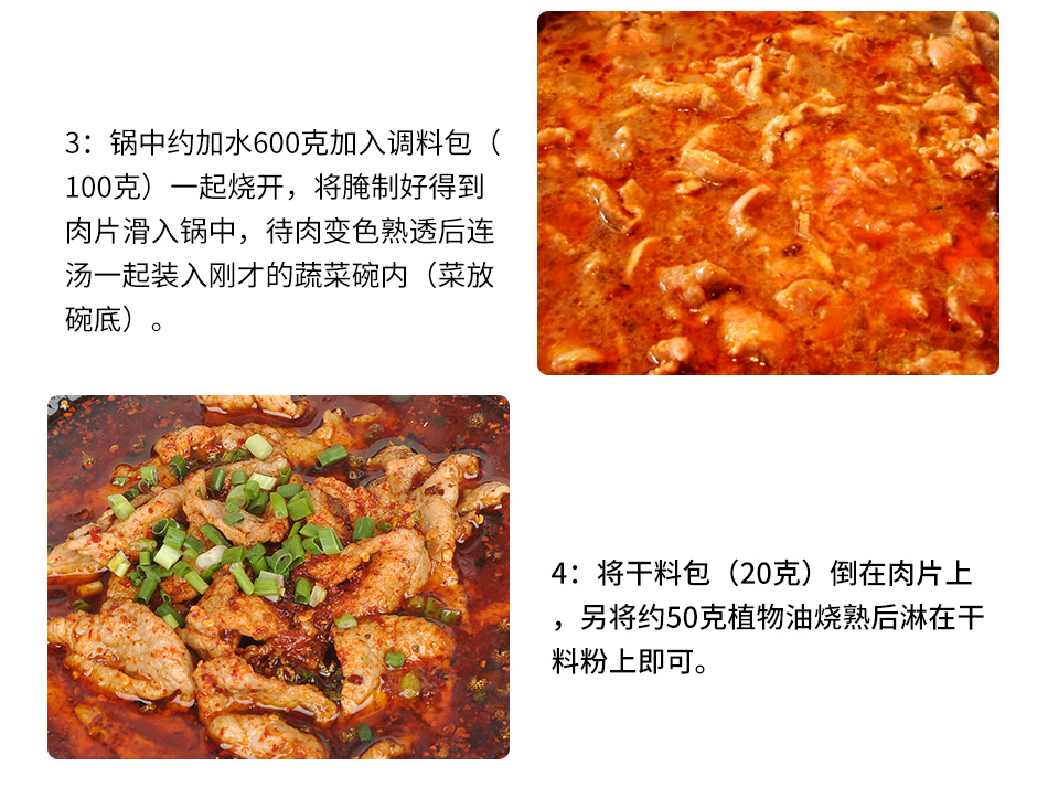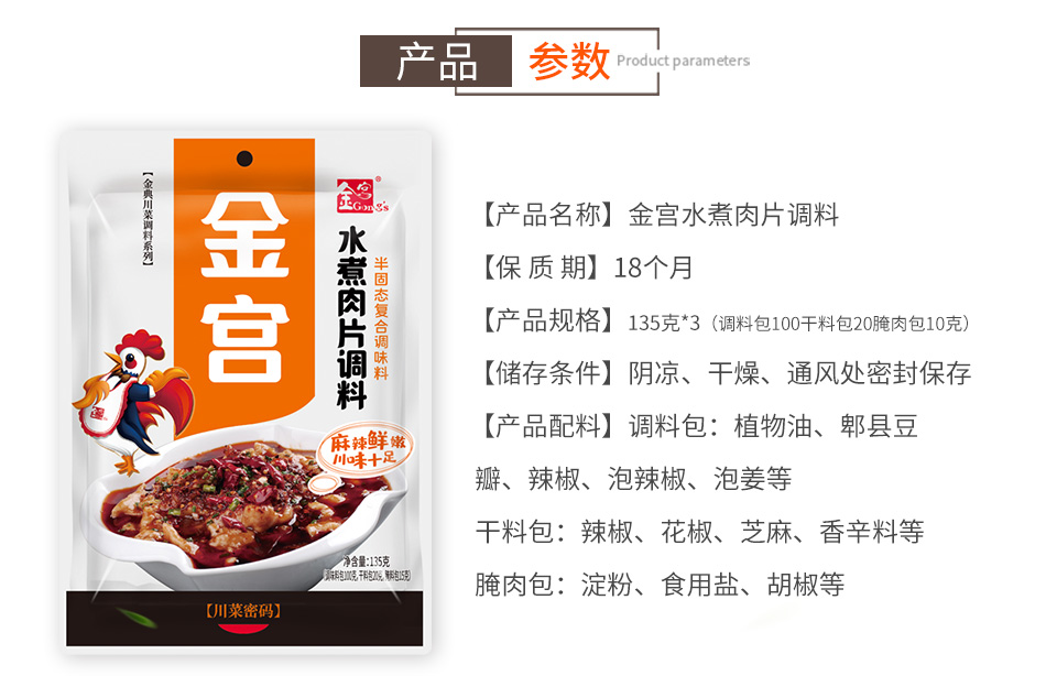 產(chǎn)品簡介:四川名菜—水煮肉片,起源于四川自貢,是一道地方名菜,其特色麻辣鮮香,為四川家常美食之一。金宮水煮肉片調(diào)料傳承經(jīng)典,創(chuàng)新研制,烹飪簡單易上手,湯紅油亮,麻辣味濃,椒香突出,和家人朋友一起分享美味。