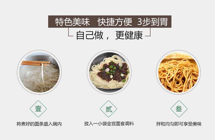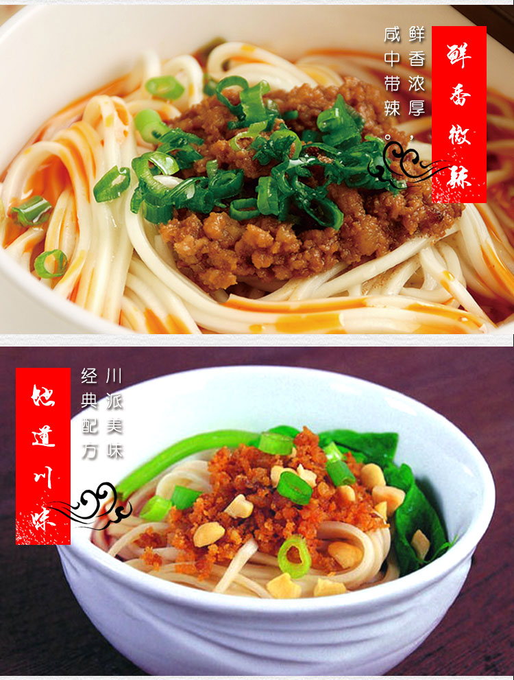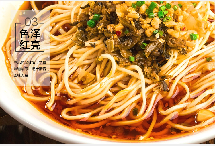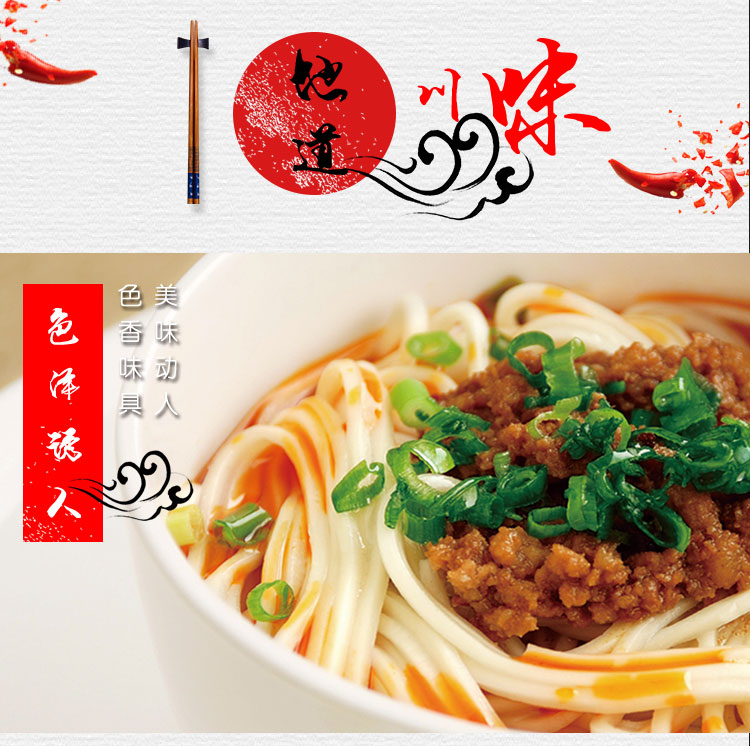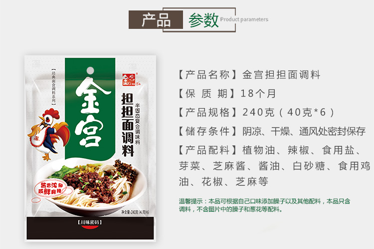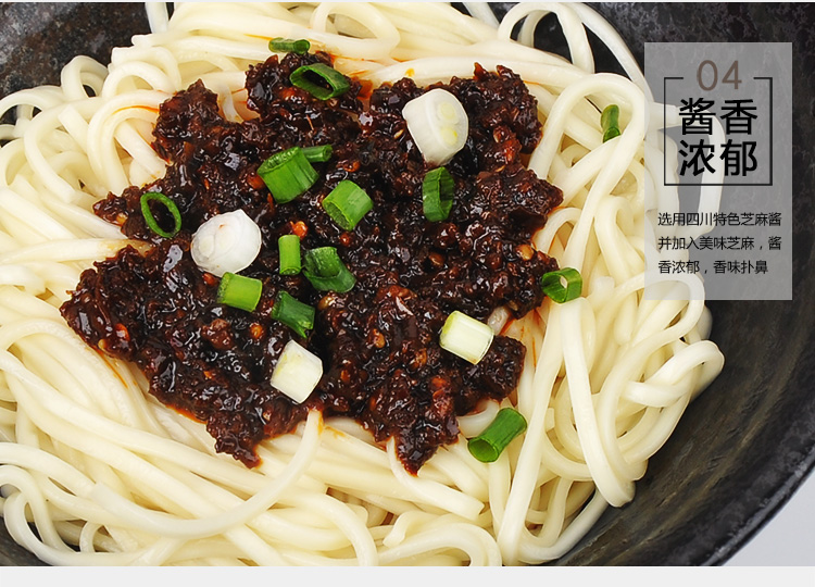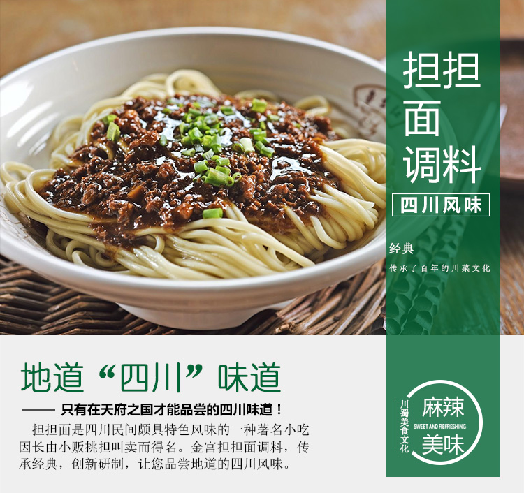 產品簡介:四川名菜—擔擔面,是四川民間頗具特色風味的一種著名小吃,因常由小販挑擔叫賣,而由此得名。金宮擔擔面調料,傳承經典,創(chuàng)新研制,做出的面以色澤紅亮、將香撲鼻、咸鮮麻辣為特色,細品慢嚼,其湯汁酥香,芽菜風味突出,回味無窮。