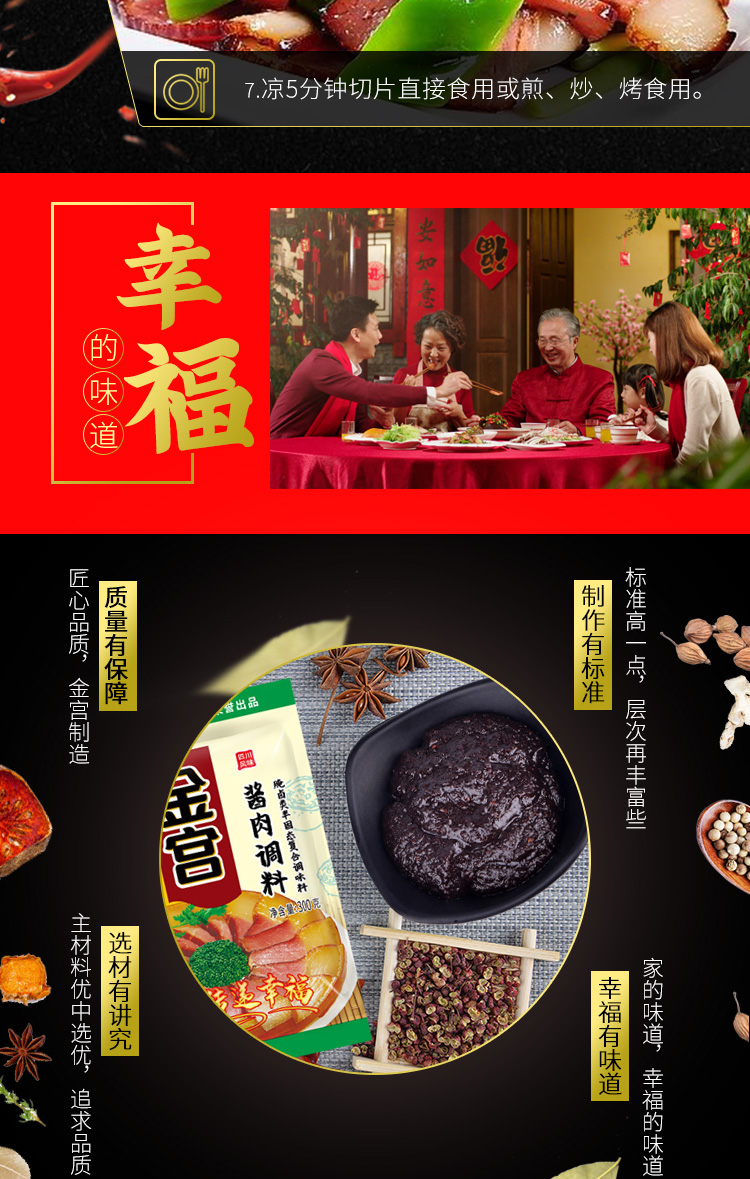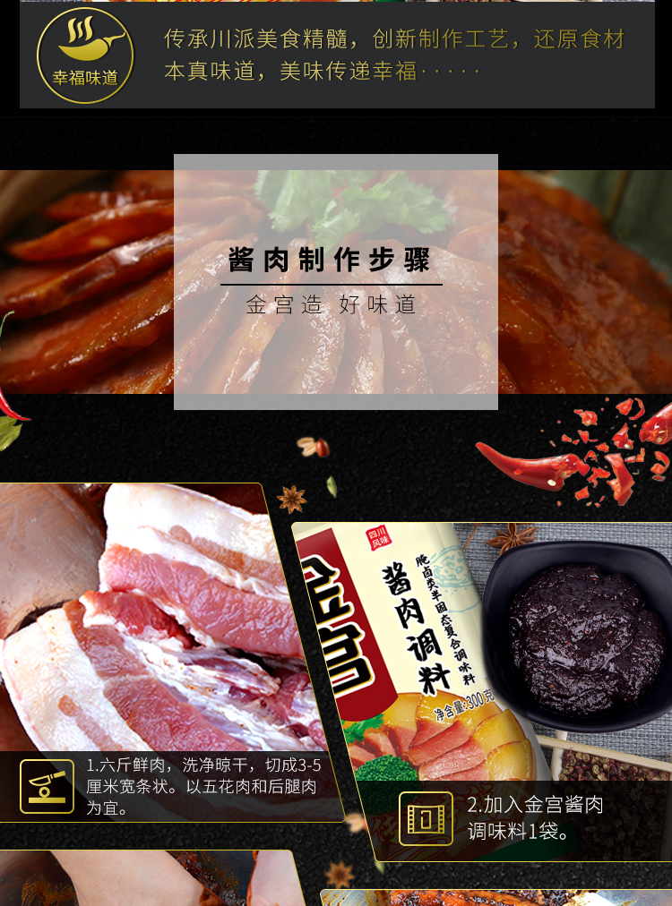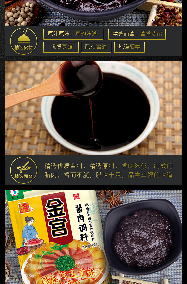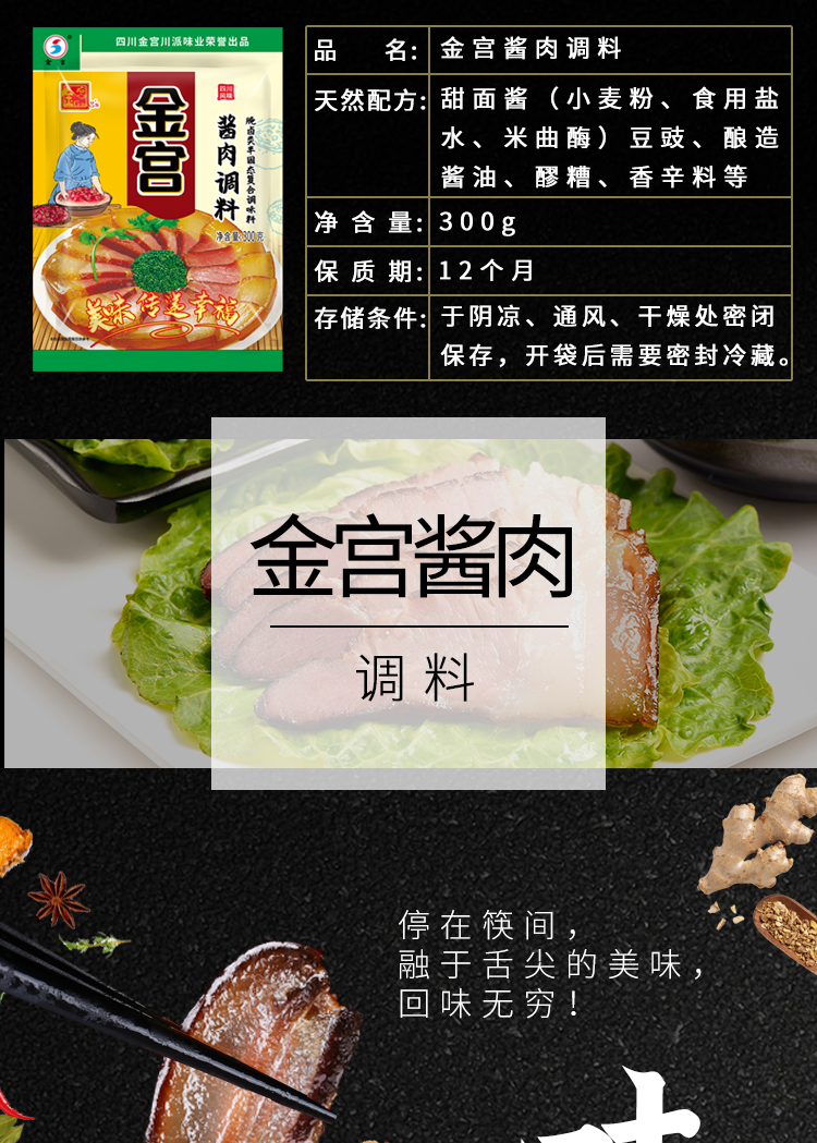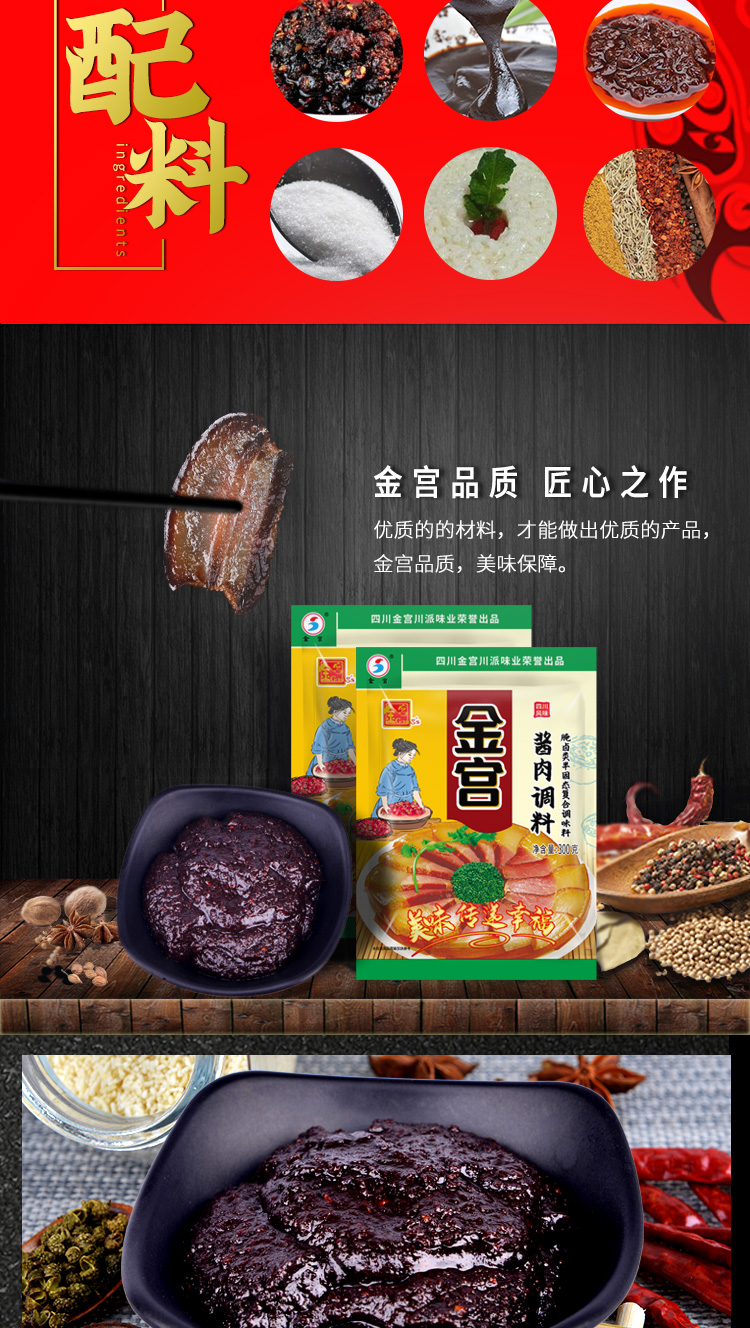 產(chǎn)品簡介:本品精選多種四川本地優(yōu)質(zhì)原料,用本調(diào)料制作的醬肉充分體現(xiàn)了醬香濃郁、肥而不膩、瘦而不柴、滋味鮮美的特點,是家庭、食堂、餐廳制作四川醬肉的上乘調(diào)料。