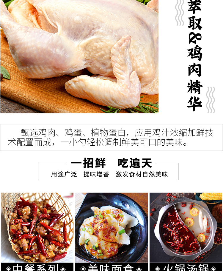 產(chǎn)品簡介:本品采用高科技和新工藝精致而成,具有上等雞湯的精華,味道鮮美、香氣濃郁,是家庭、酒樓、餐飲、火鍋、點心及食品加工的調(diào)味佳品。